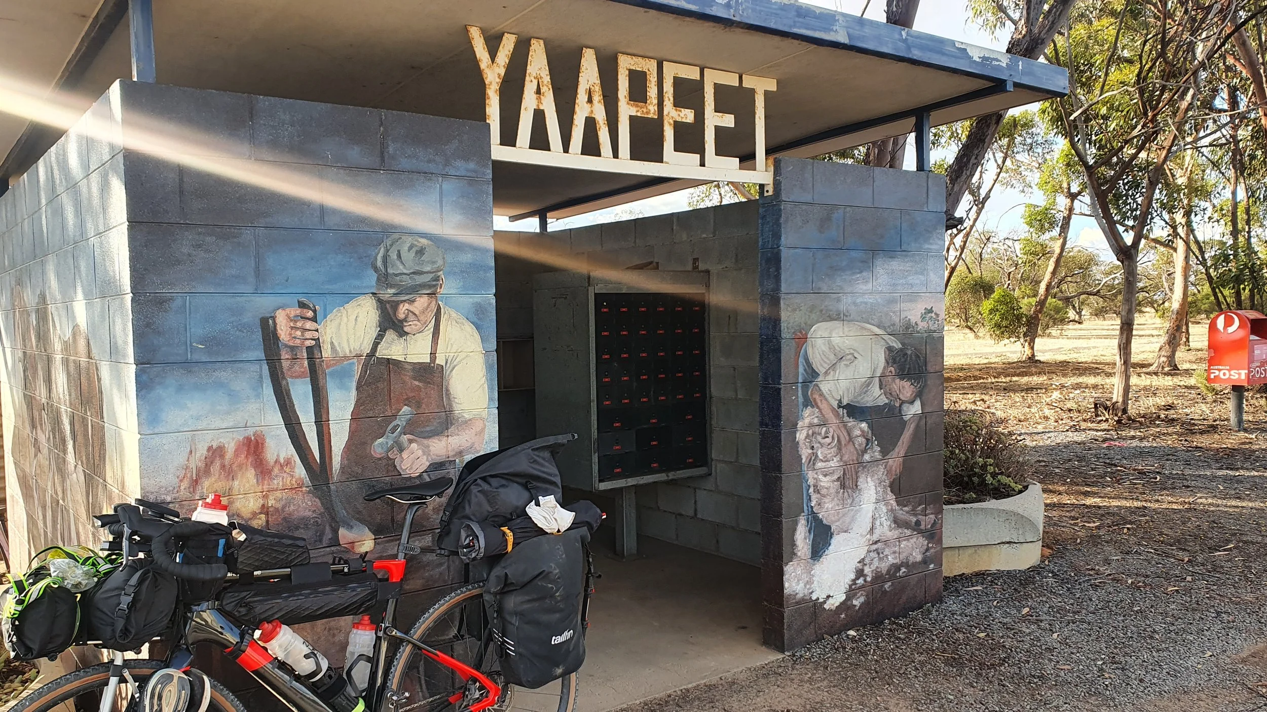 The use of a silo as a canvas is impressive. Seeing the sun break through the afternoon clouds added to the moment. Only hours earlier I wanted to give up, find an airconditioned room and stay at Rainbow. Here I am alone, taking in an artistic endeavour. I struggled to find public water at Yaapeet and should have just stopped in at someone's house. What I did find, I am not sure was drinkable.
